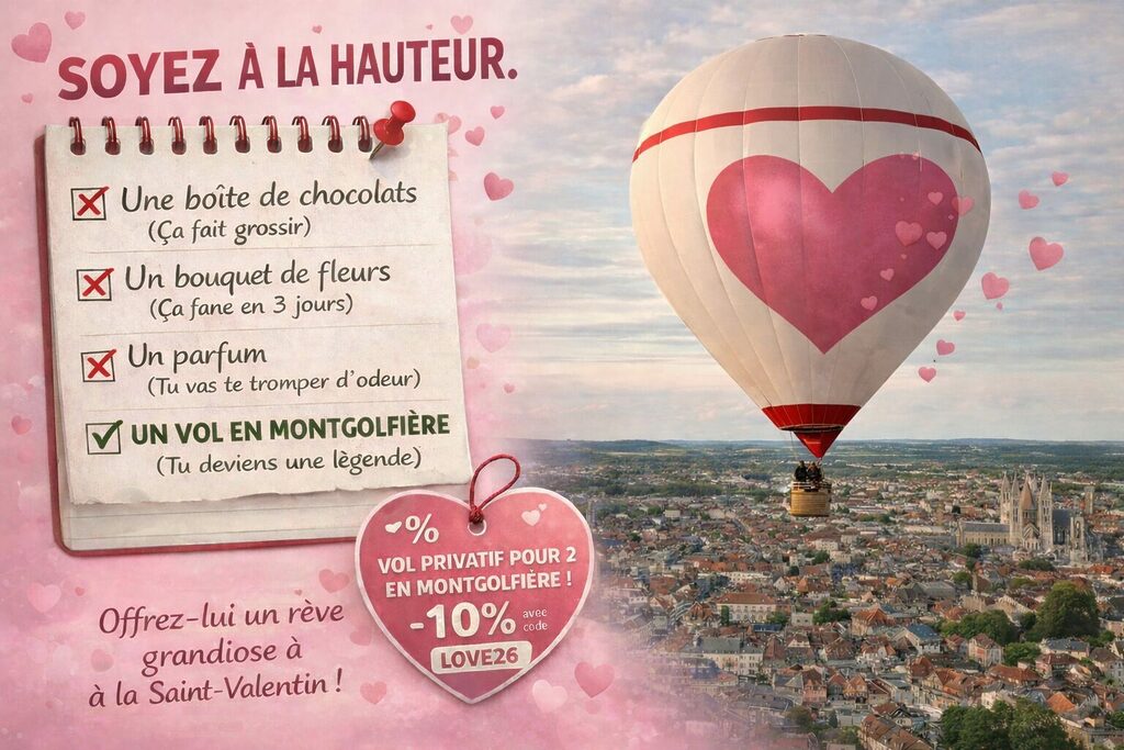 Le vol en montgolfière de +/- 1 heure pour 4 adultes suivant les conditions météos, les endroits d’atterrissage et de l’heure du coucher du soleil ;